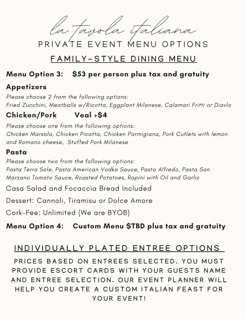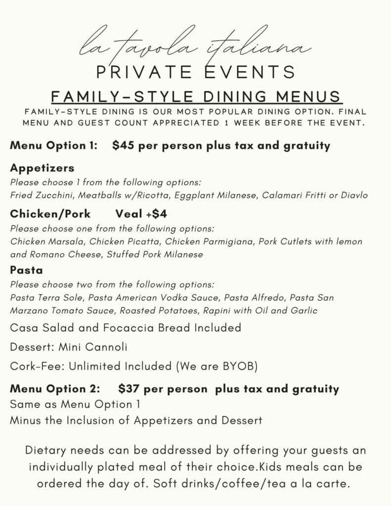 **NO OUTSIDE CANNOLI, TIRAMISU OR ANY OTHER DESSERTS WE SERVE AT LA TAVOLA ARE TO BE BROUGHT IN**